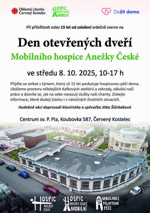 Přijďte se setkat s týmem, který už 15 let poskytuje hospicovou péči doma. V otevřených prostorách pečovatelského domu a bývalé Kafkovy vily a ateliérů v Centru sv. P. Pia budou stanoviště, u kterých vám pracovníci hospice přiblíží činnost i dalších služeb Oblastní charity Červený Kostelec. Komentované prohlídky probíhají v každou sudou hodinu. Hudebně akci doprovodí Jitka Štěrbáková, klavíristka a zpěvačka působící ve Francii.