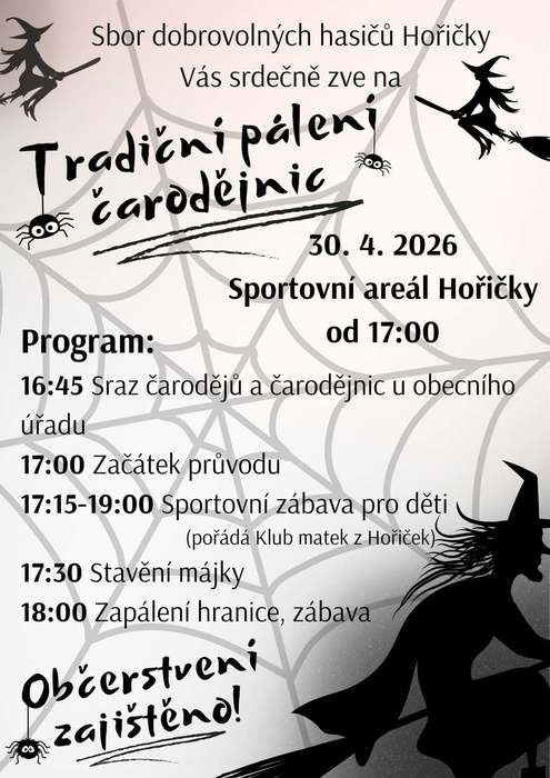 Sbor dobrovolných hasičů Hořičky srdečně zve všechny občany i návštěvníky na tradiční pálení čarodějnic, které se uskuteční ve středu 30. dubna 2026 ve sportovním areálu Hořičky.