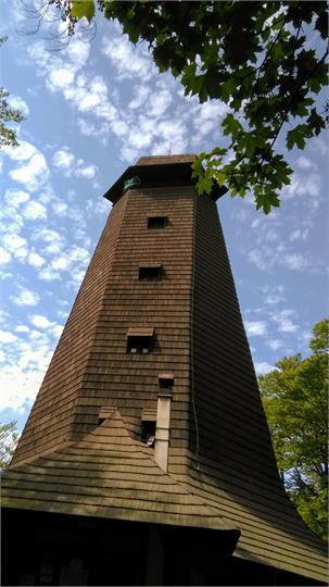 Pro bystré pozorovatele ještě jedna fotografie z Velkého Blaníku. Na velké rozhledně hledejte malou vlajku. Louňovice pod Blaníkem