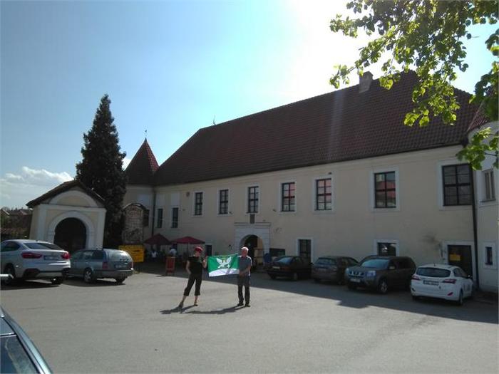 Dva vlajkonoši a jedna vlajka. To vše před vstupem do zámku v Louňovicích pod Blaníkem.